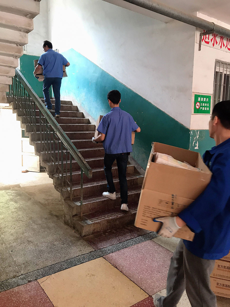 夏日來臨,氣溫升高,道路維修,行車不便。與此同時,藥材科的樓還沒有電梯,為了保證藥品的及時供給,大家不懼高溫、不畏辛勞,用推車把藥品送到樓下,再一件件扛到三樓。